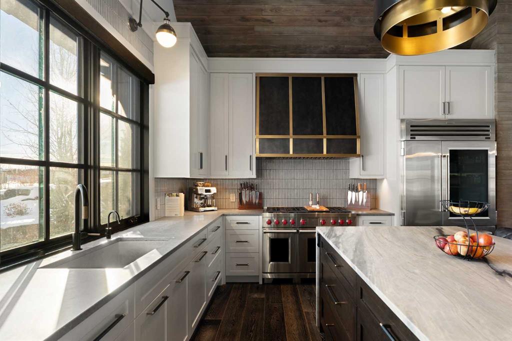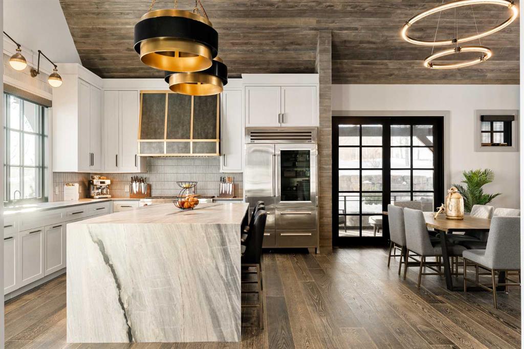 Step inside to a grand foyer with rich hardwood floors and a charming telephone-booth office with custom built-ins. The kitchen is a showpiece with vaulted ceilings with wood panel accents, a striking waterfall island, two-toned cabinetry, and top-tier appliances including a Wolf gas stove and convection oven, Sub-Zero fridge, and an artful custom range hood. A walk in pantry adds additional storage, a steam oven, sink, and the ultimate coffee bar area. The dining area opens to the side deck for seamless indoor-outdoor living, while the living room centers around a floor-to-ceiling fireplace that defines luxury and invites the family to gather.