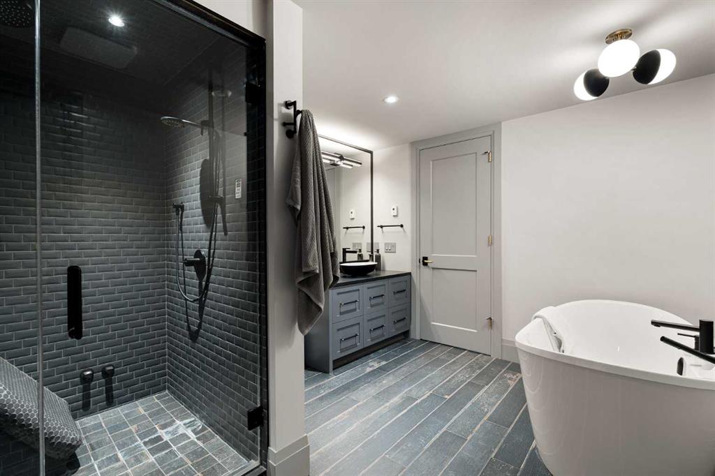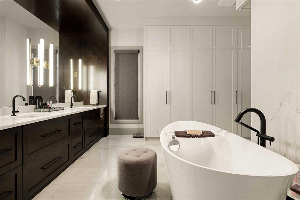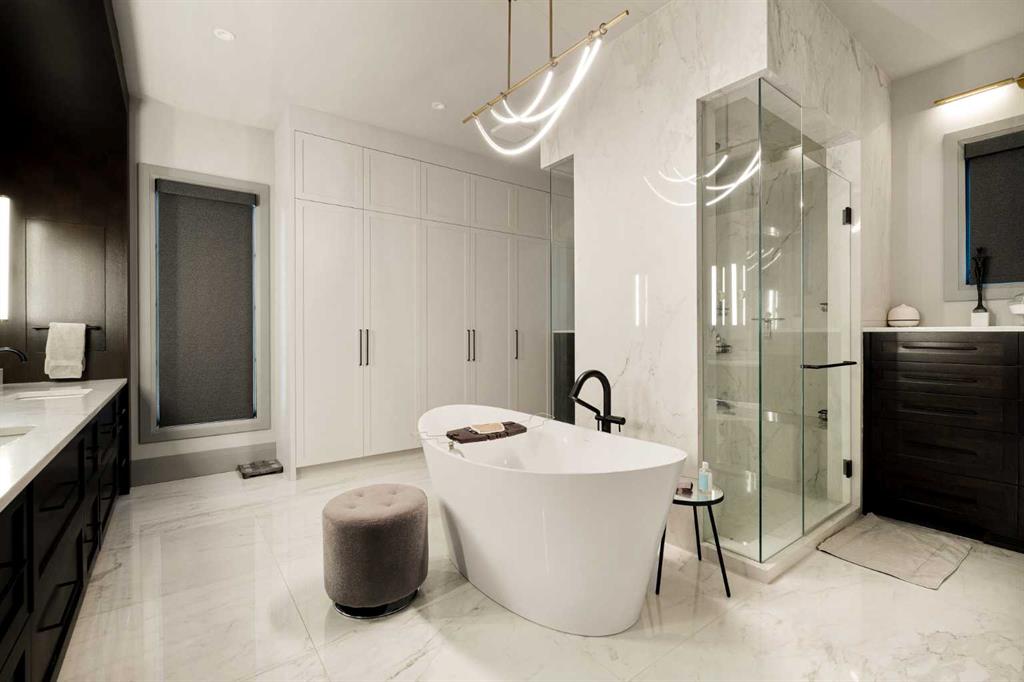 The main floor primary retreat offers a custom closet and spa-like ensuite with a large soaker tub, dual sinks, glass shower, and abundant storage.
